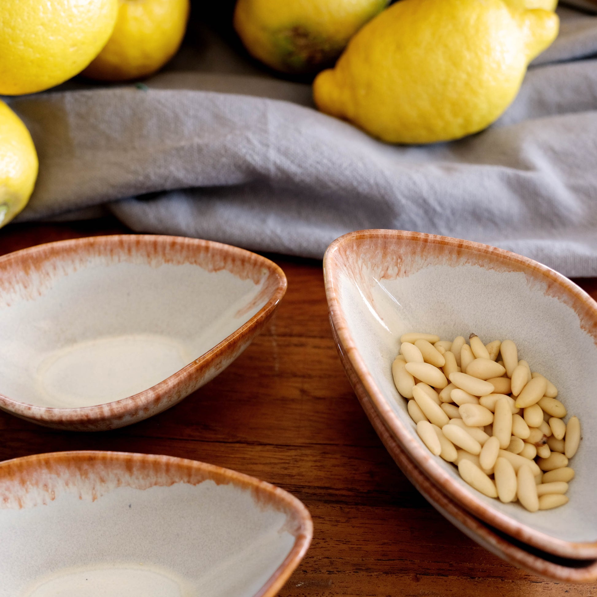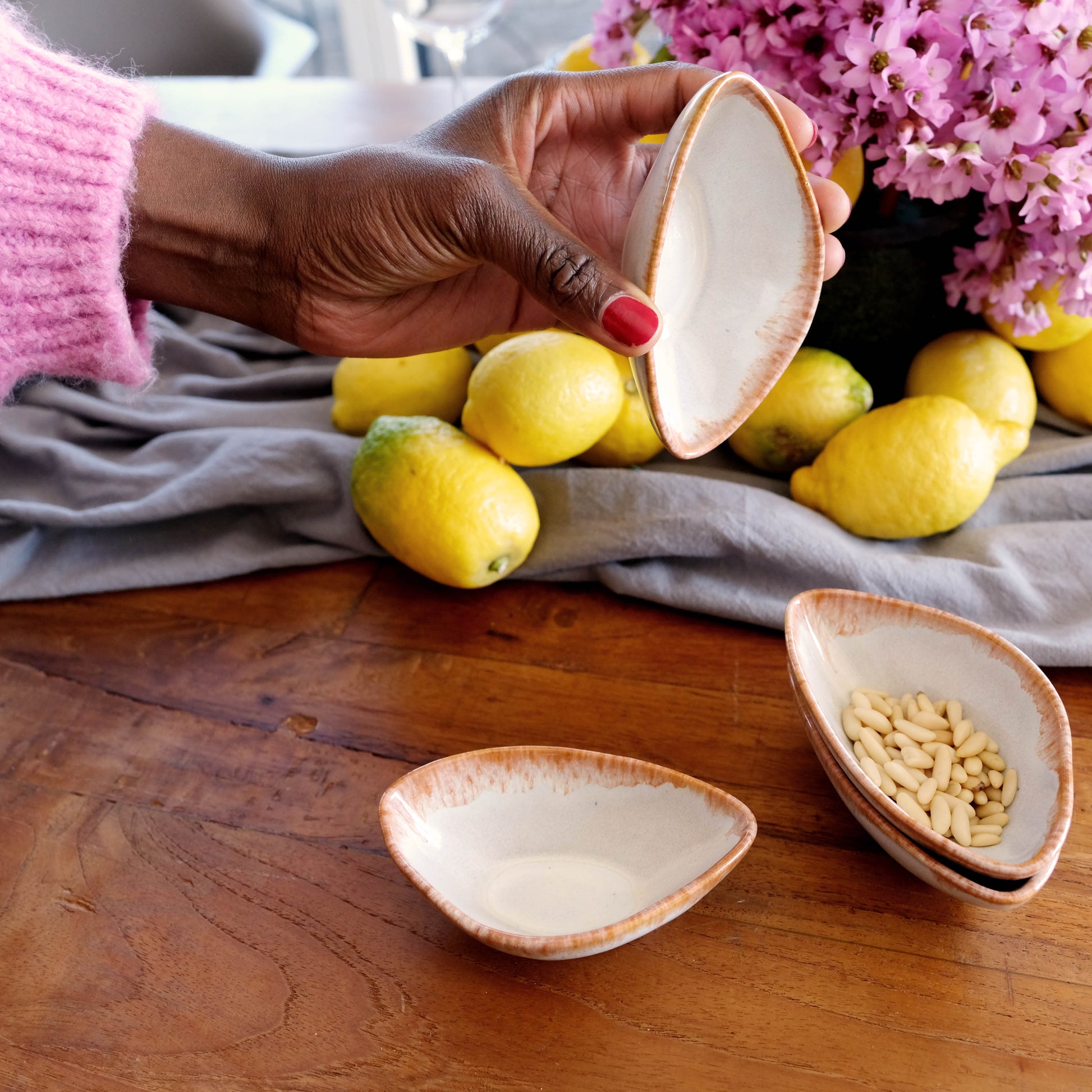 Jeder liebevoll gedeckte Tisch lebt von den kleinen Details: Ein Klecks Pesto auf dem Teller, eine Auswahl an feinen Dips oder ein paar knackige Nüsse zum Aperitif. Genau dafür ist das Krumme Lanke Dip-Schalen Set gemacht. Mit ihren sanften, organischen Formen und der schimmernden, reaktiven Glasur sind sie nicht nur praktisch, sondern auch wunderschön anzusehen – ein Hauch von Eleganz für jede Mahlzeit.